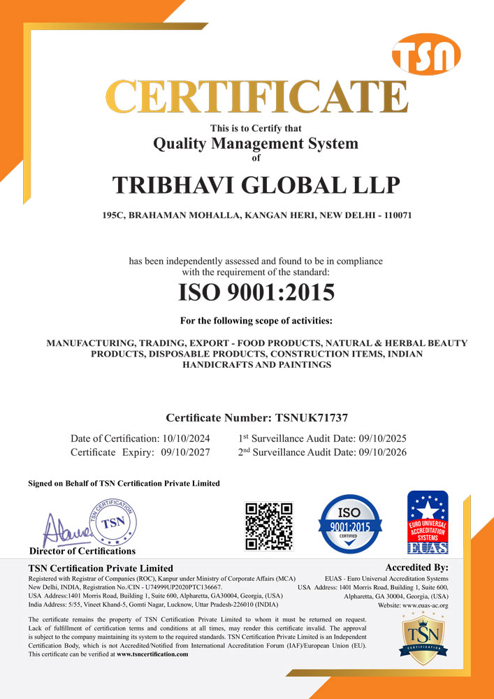 Tribhavi Global LLP is committed to maintaining the highest standards of quality and integrity. We hold multiple industry accreditations that reflect our dedication to excellence in every product we offer. These certifications enhance our reputation as a trusted partner for businesses seeking global growth and expansion.